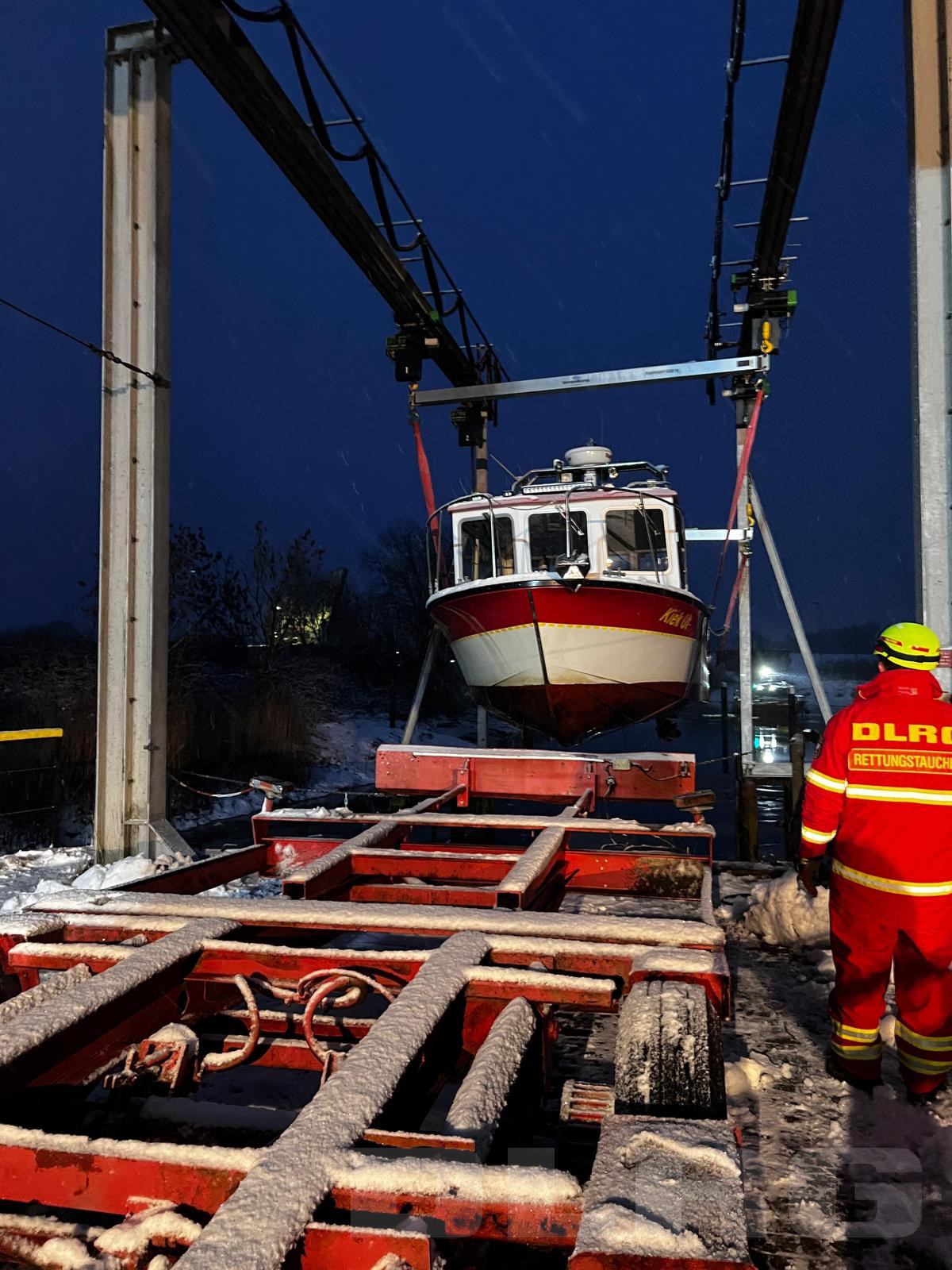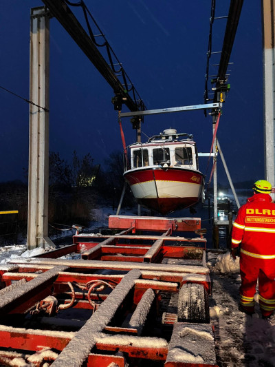 Das MRB „Kiek ut“ hatte zuvor zum Schutz vor Schäden durch Treibeis in der Krananlage gelegen. Aufgrund der tiefen Temperaturen mussten durch die eingesetzten DLRG-Kameradinnen und Kameraden unmittelbar nach dem Kranvorgang entsprechende Winterschutzmaßnahmen am MRB durchgeführt werden.